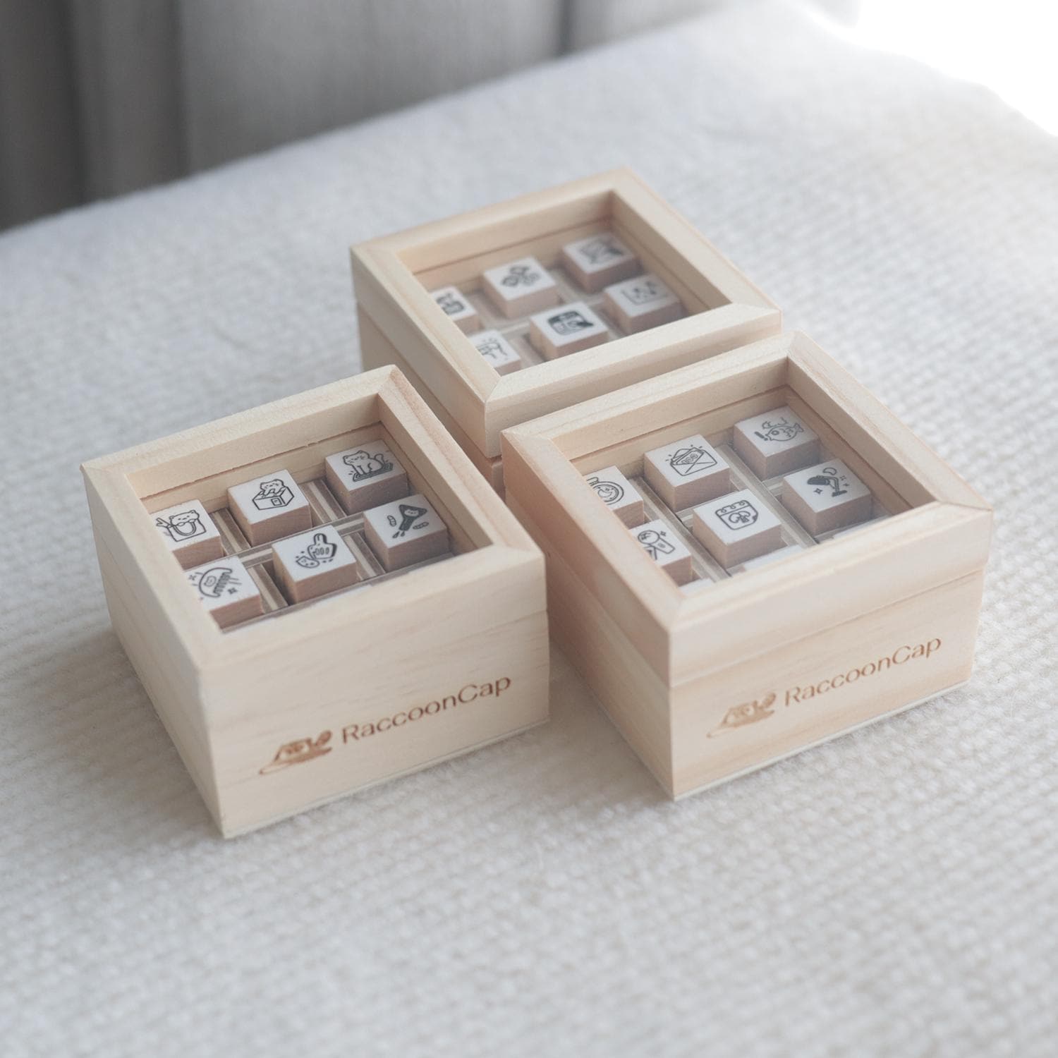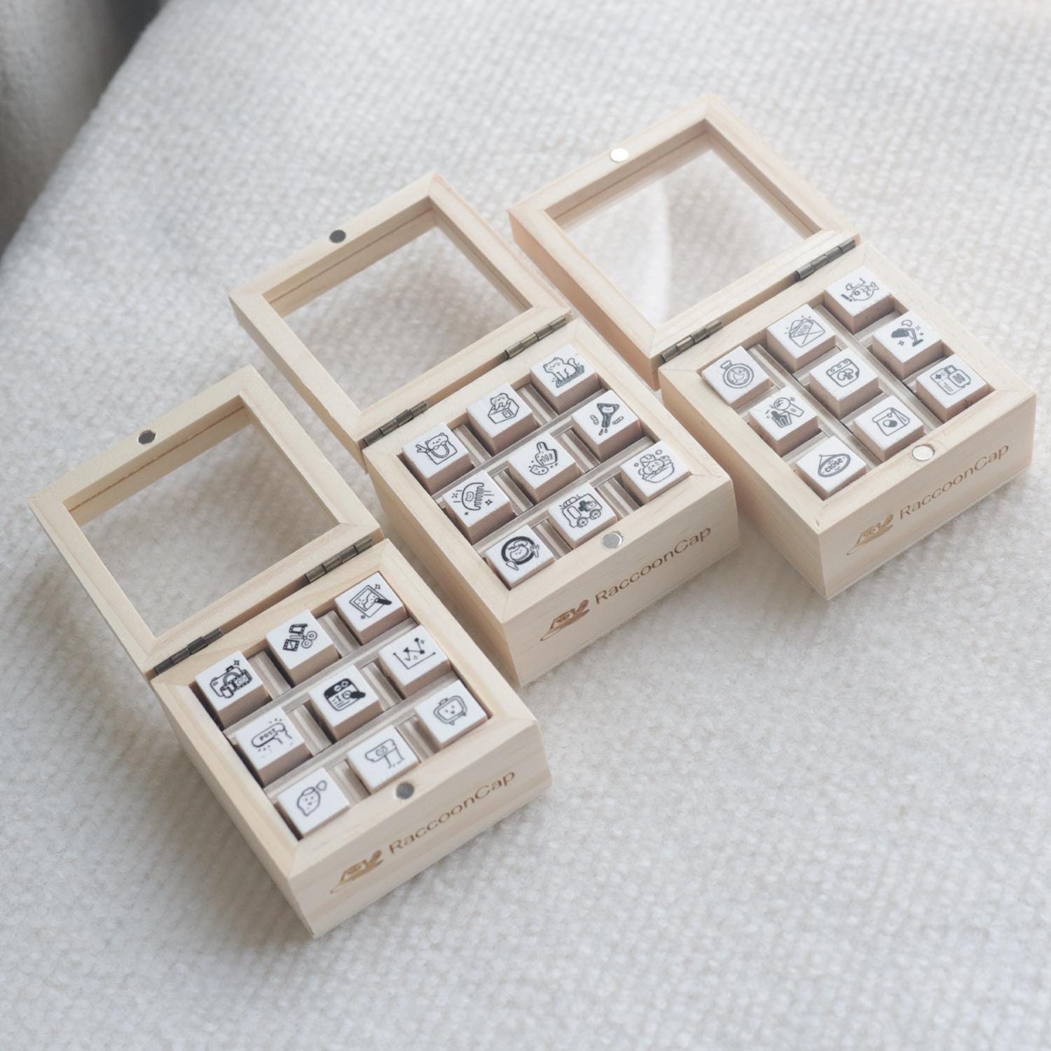 猫好き / 日々の仕事 / ソーシャルメディア 木製ゴム印、9つのコンパートメントがある木箱